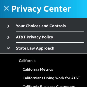 AT&T tasked our team with redesigning and restructuring their Privacy Center, the online home of their Privacy Policy and all related topics and documents. Though a major brand change was the impetus for the update, the site had become a bit of a Frankenstein without clear hierarchy or content strategy — and the user journey was difficult. This was particularly worrisome with new legislation about "dark patterns" that regulated how easy it was to find content. The biggest hurdle was implementing a navigation that could grow with the site — which was growing rapidly.
