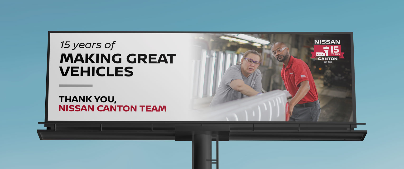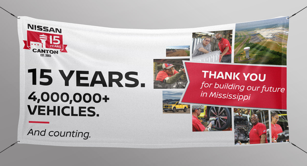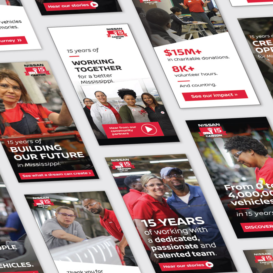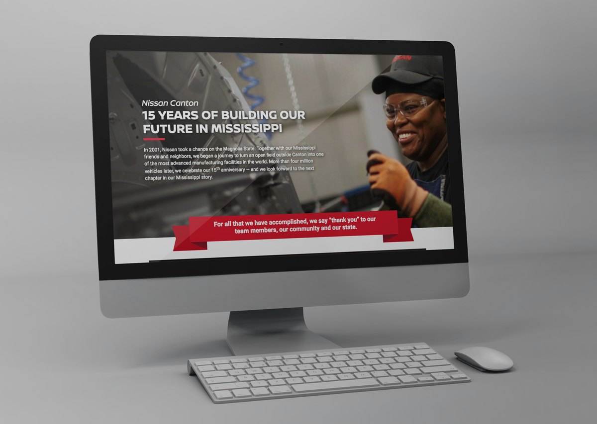 The Nissan Canton manufacturing plant wanted to celebrate 15 years in Canton, Mississippi — to recognize the contributions of employees (many had been there since the very beginning), community members, and the economic impact of the company on the surrounding area. We created a surround-sound campaign that included display ads, newspaper ads, billboards, a website, in-plant environmental materials, and more.