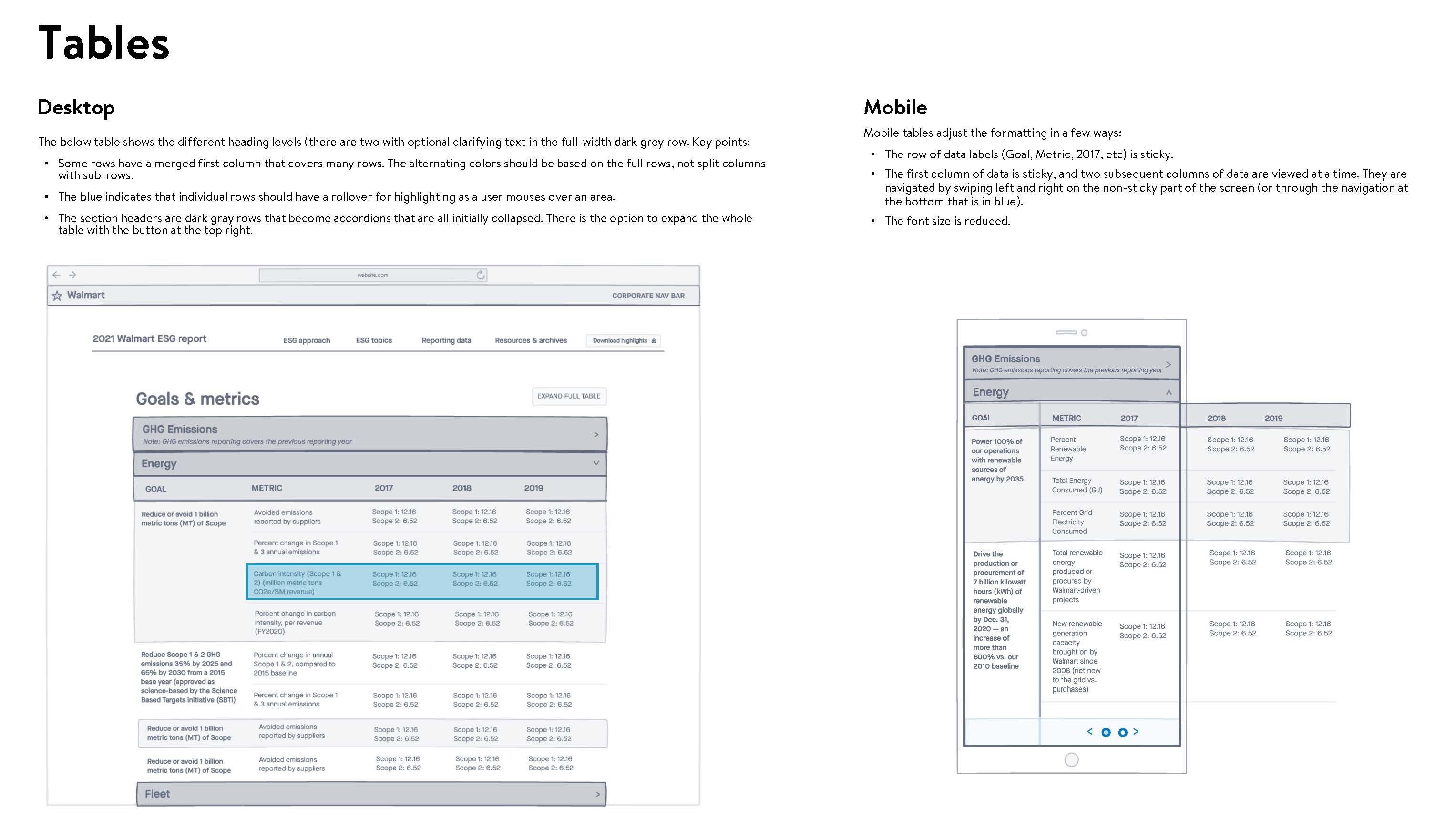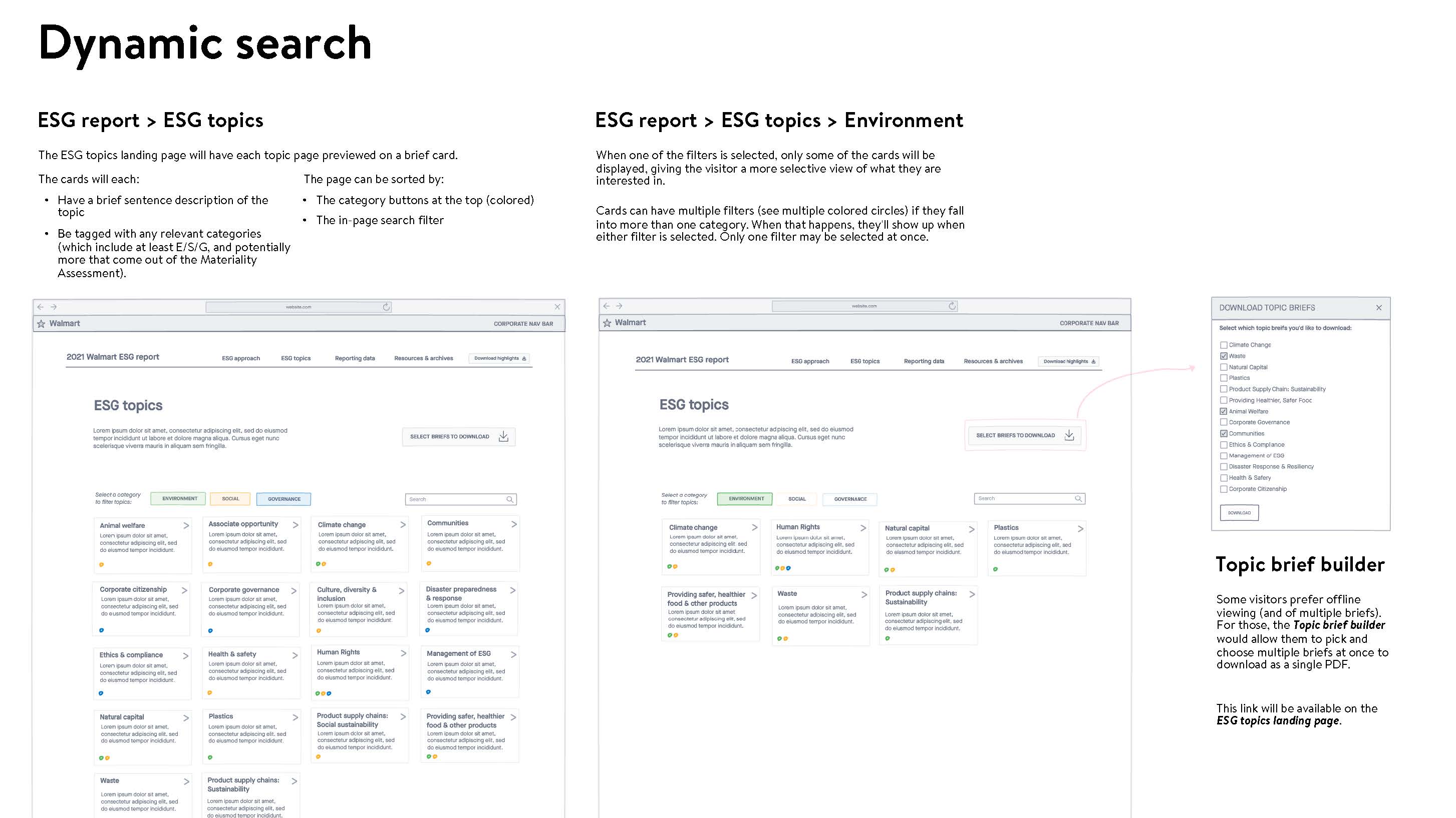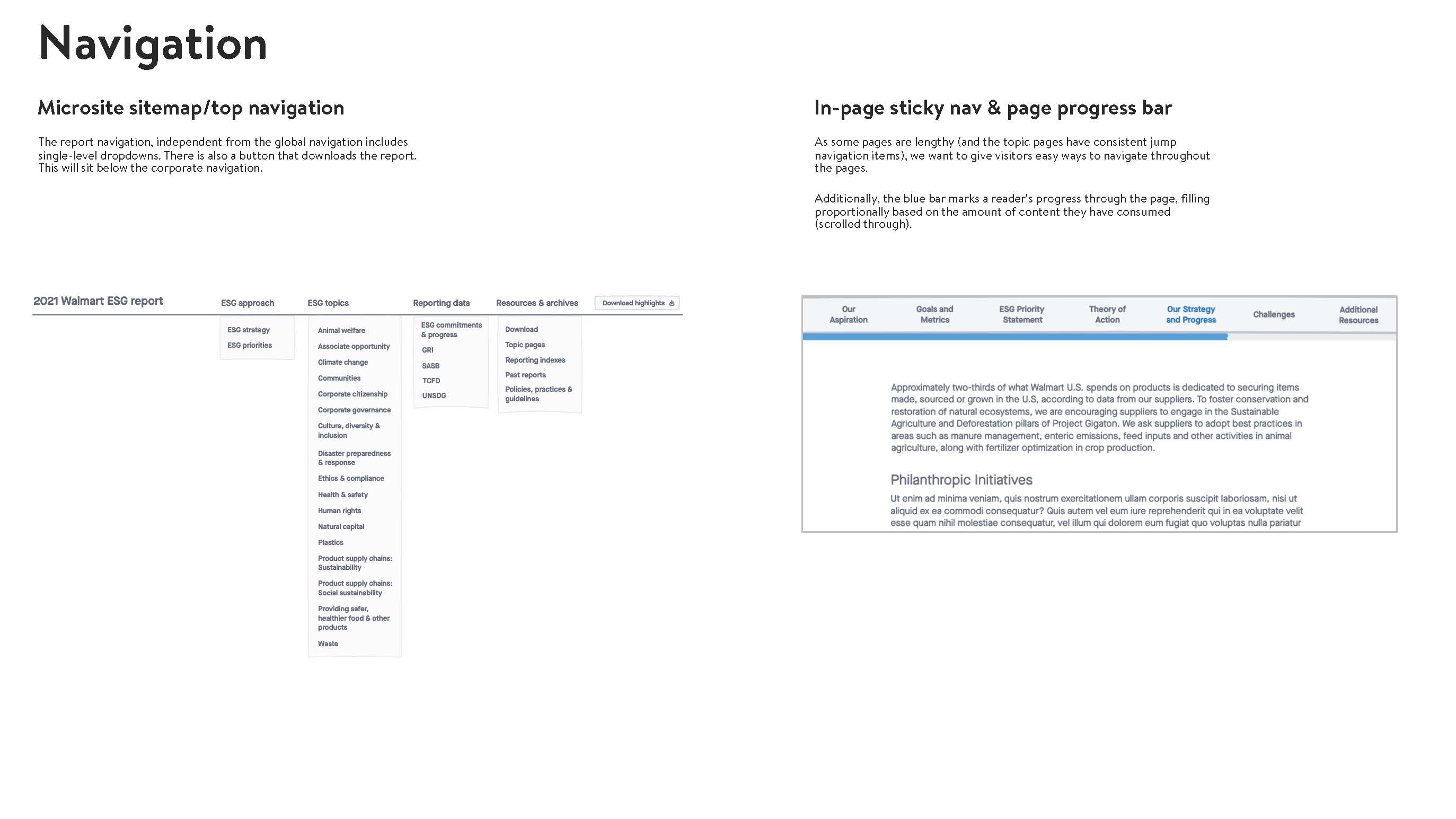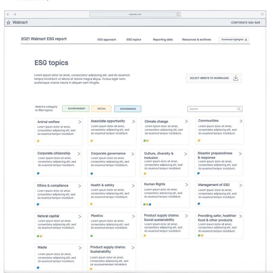 Walmart wanted to transition their ESG (Environmental, Social, and Governance) Report from an exclusively-PDF document (that was about 150 pages) to one that was primarily on the internet. They engaged with our team to come up with a compelling content strategy, easy-to-use interface, and beautiful design aligned with their existing components.